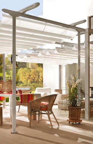 Für besonders große Flächen oder wenn eine Wandmontage nicht möglich ist, bieten Pergola-Markisen die ideale Alternative. Mit stabilen Stützpfosten und hoher Windresistenz überspannen sie große Terrassen- und Gastronomieflächen zuverlässig und elegant.